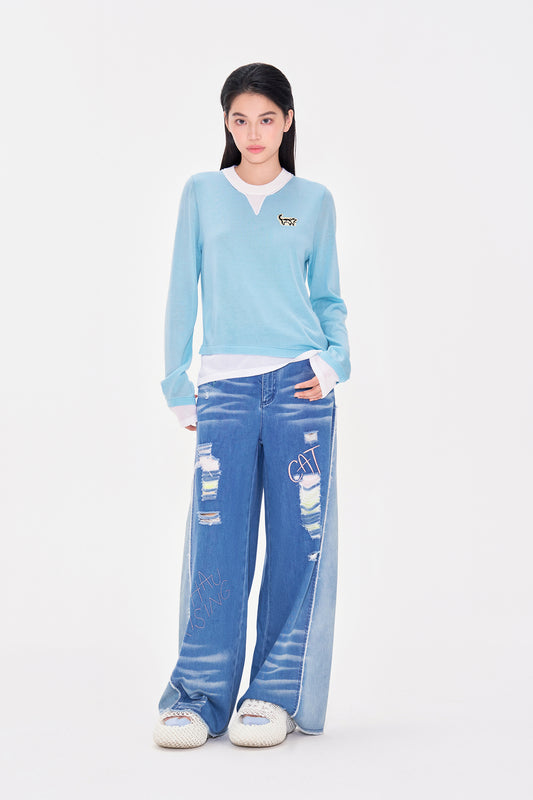 Cat logo Fake Two piece Wool Pullover