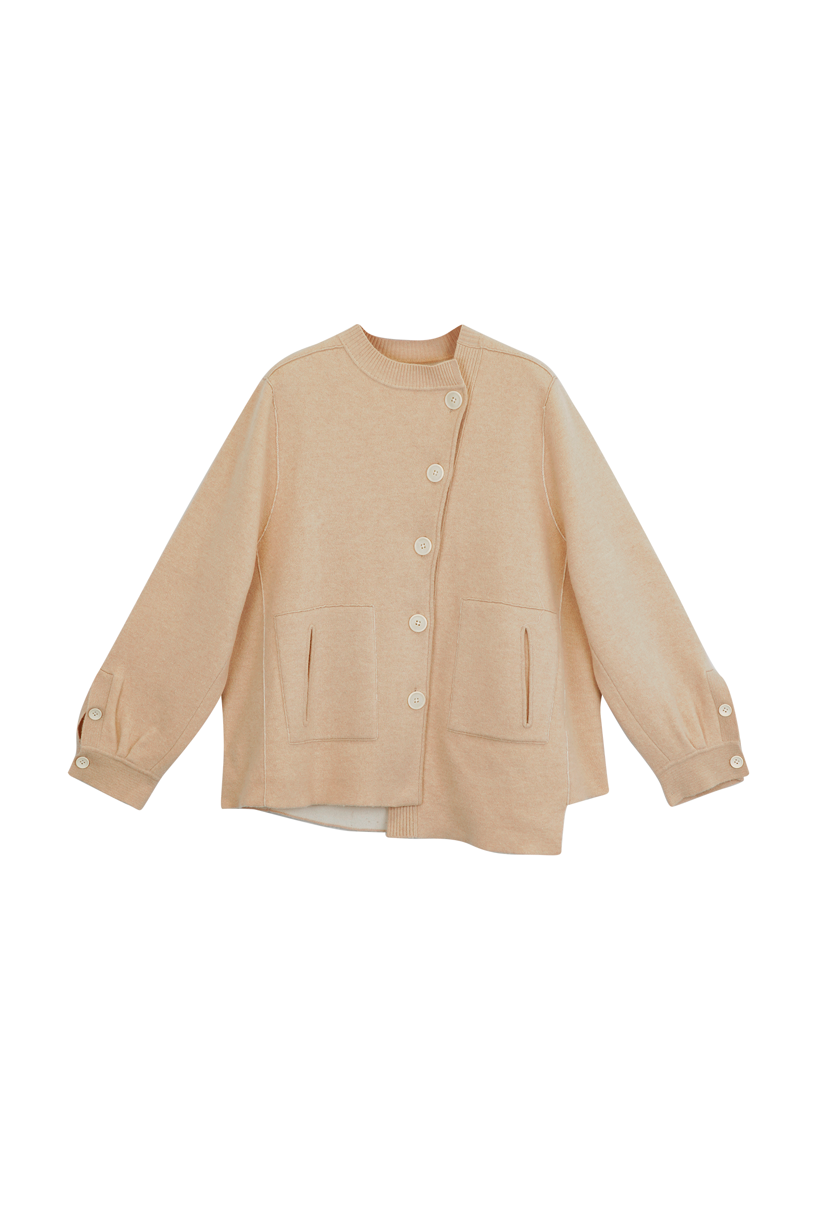 The slanted and extended placket and slanted pockets break the norm and have a unique design sense. The sand gravel and white interior and exterior colors, as well as the two wearing characteristics, make the cardigan a rich and diverse choice in terms of practicality and matching style.